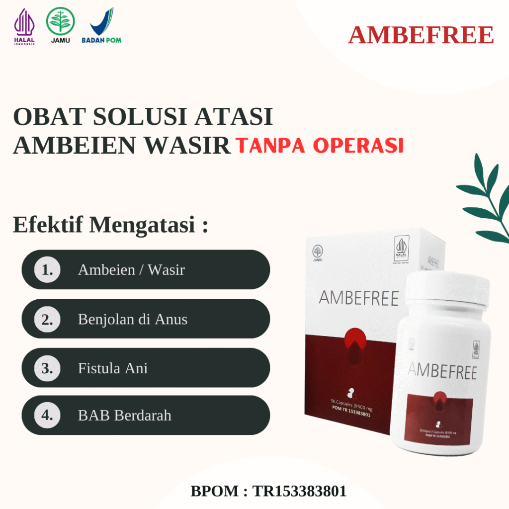 Ambefree adalah produk herbal untuk membantu meredakan gejala Wasir seperti nyeri, bengkak, gatal, hingga BAB berdarah. Dirancang dari herbal pilihan yang bekerja membantu mengurangi peradangan dan memberikan rasa nyaman pada area anus.